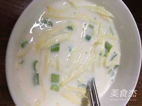 加入葱花、土豆丝和盐搅拌均匀。