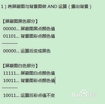 位图准备好以后,首先将屏蔽图与背景图做 AND 运算,这一步的作用是露出背景。具体原理如图所示。