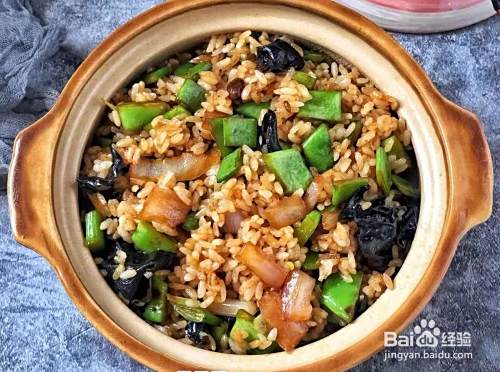 3:石锅拌饭 辣椒蘑菇炒熟,浇上酱汁