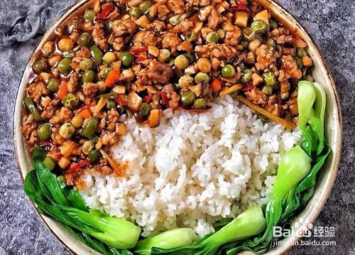 2:豌豆肉沫盖浇饭 豌豆炒熟,下肉末炒熟即可