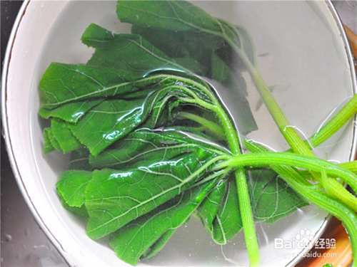 将南瓜叶放在清水里,把南瓜叶和南瓜叶互相揉搓,可将叶片上的毛搓掉,反复揉搓后用清水洗干净。