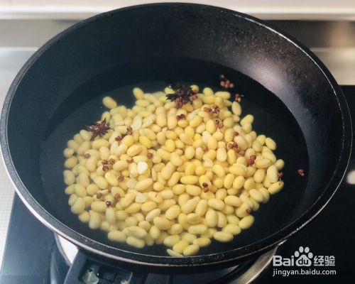 烧热水,放入黄豆,花椒,桂皮,花椒两片断生后捞出放入凉水去除黄豆皮