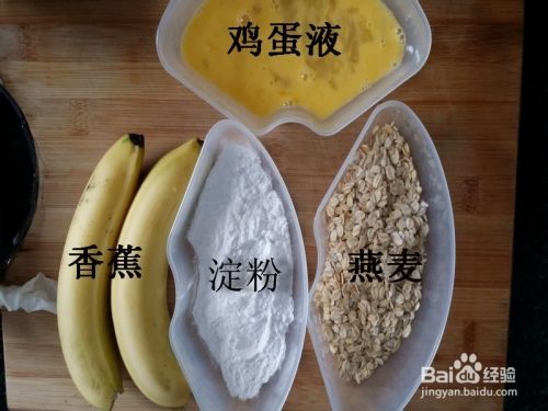先把材料准备好,如拿出2个香蕉、把淀粉、燕麦片倒入碗中备用。鸡蛋打散。