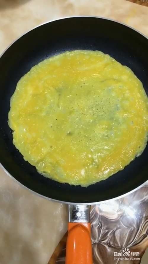 碗中打入两个鸡蛋,加入10g盐,倒入平底锅摊成小饼,倒入炒好米饭,包起来即可