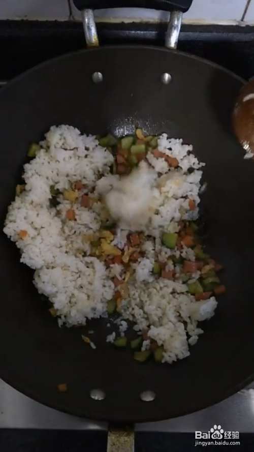 起锅烧油,加入10g蒜,倒入,30g胡萝卜丁,30g黄瓜丁,30g火腿丁,30g熟鸡蛋丁,10克蚝油,10克生抽,10g盐,100g米饭,翻炒均匀备用