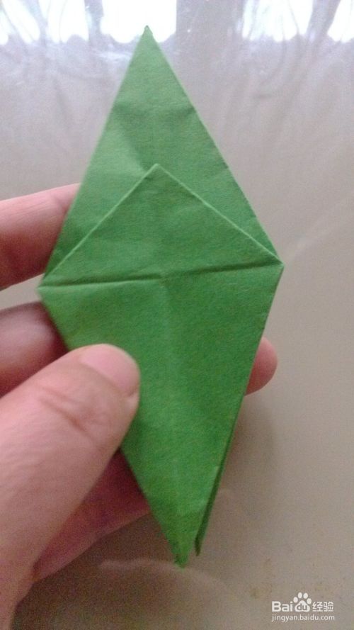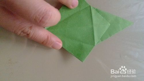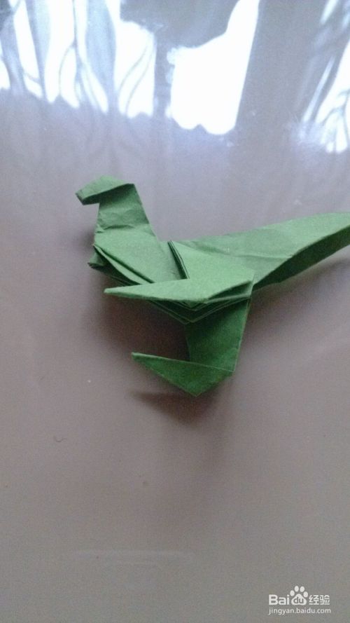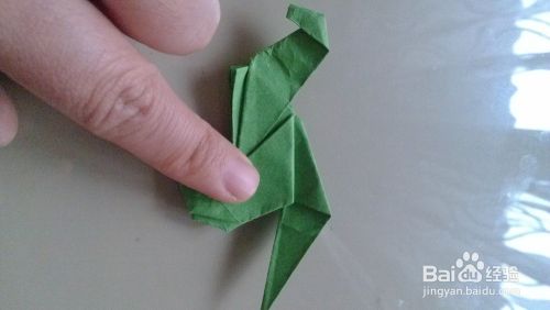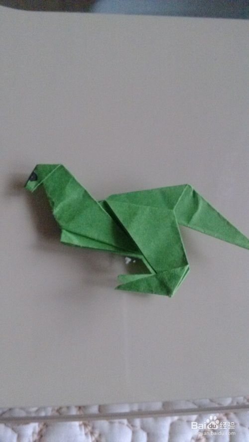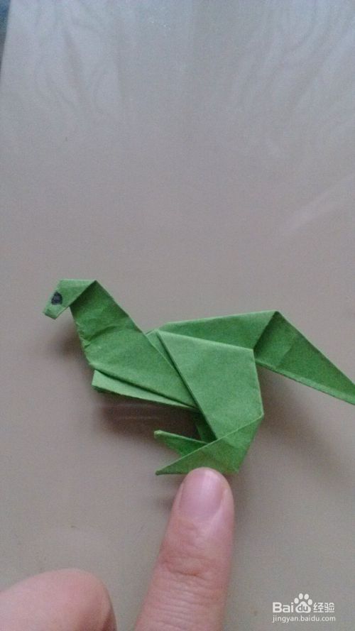把下方的两个角底部向上折一点,然后把打开里面反方向按压形一个脚的样子,另一个角也是一样,最上方的一个角向上折,展开后向内折,就形了图中那样。用笔画上眼睛,一个小恐龙就折好了。