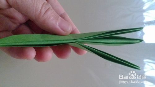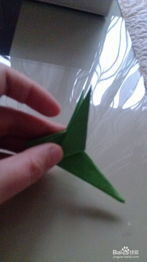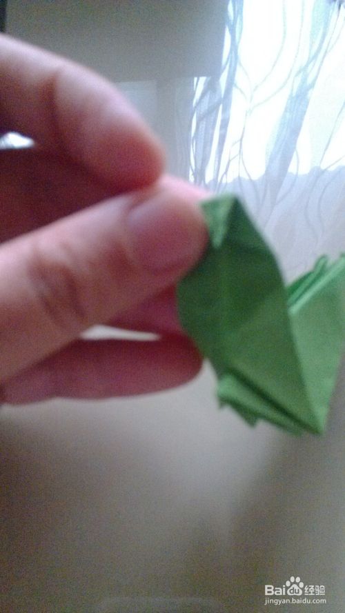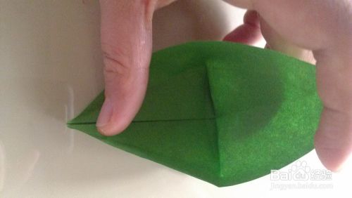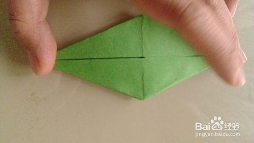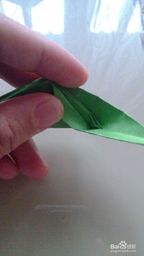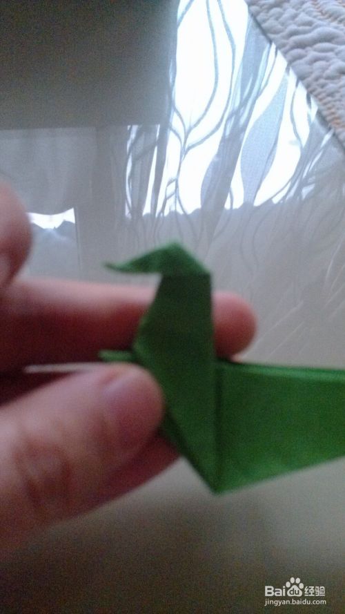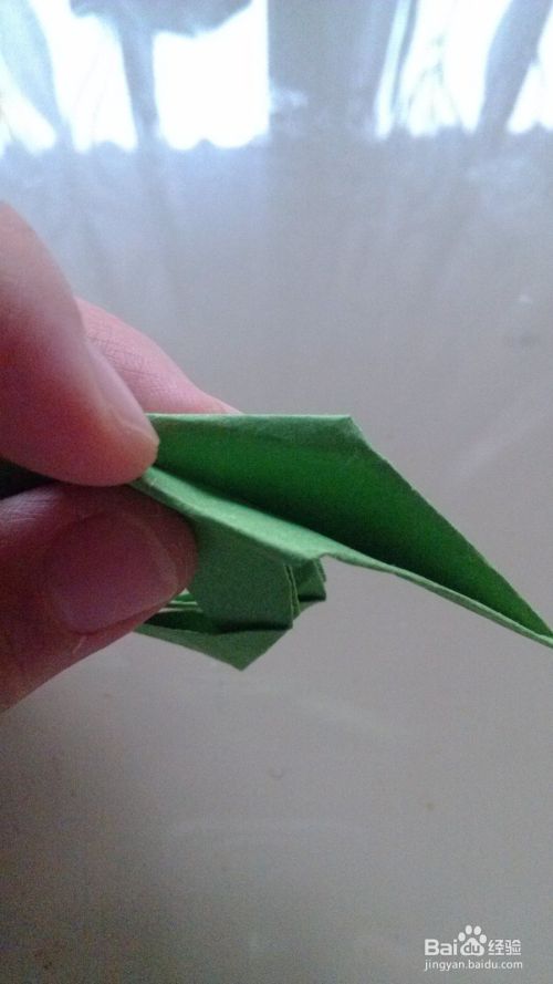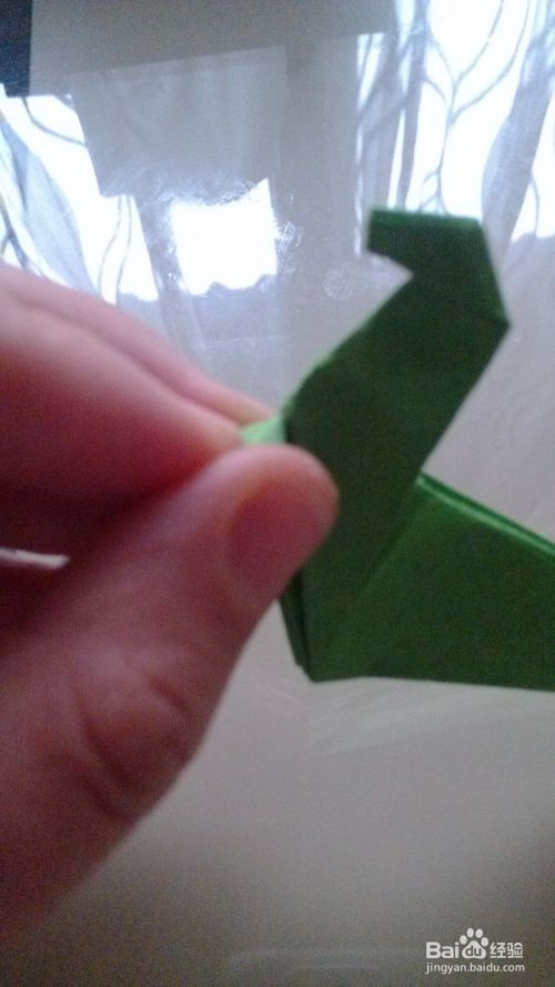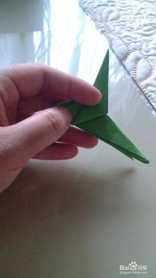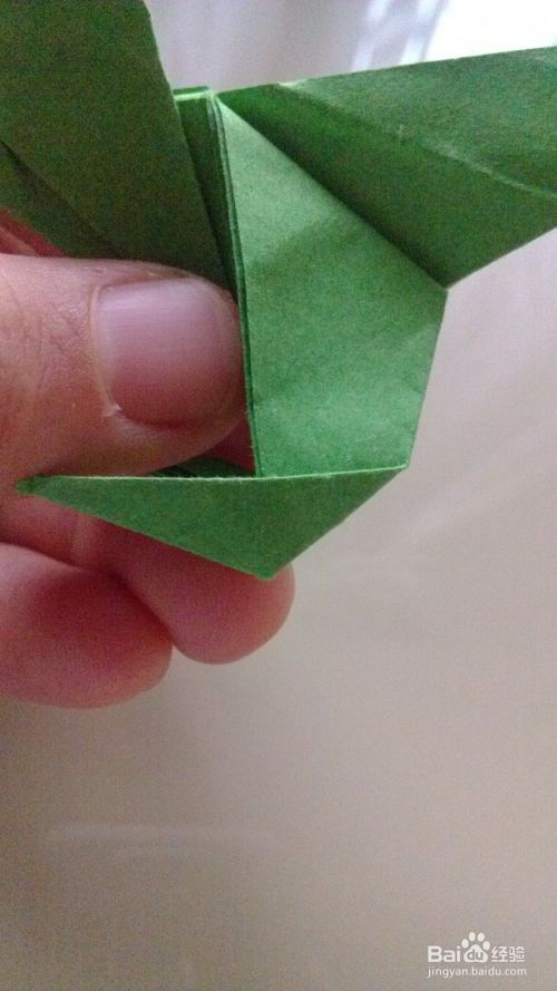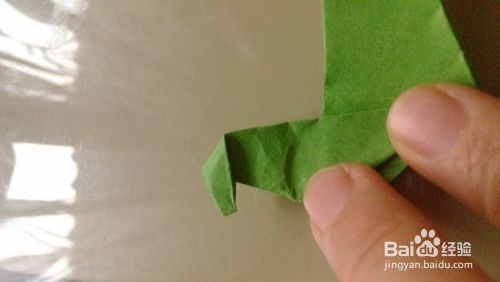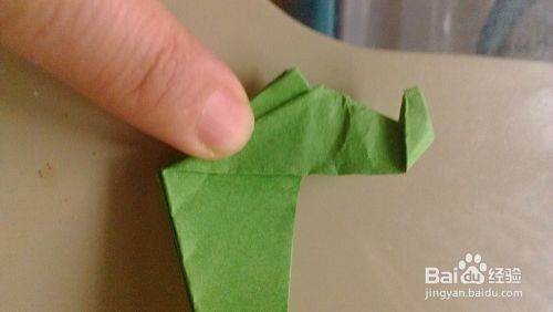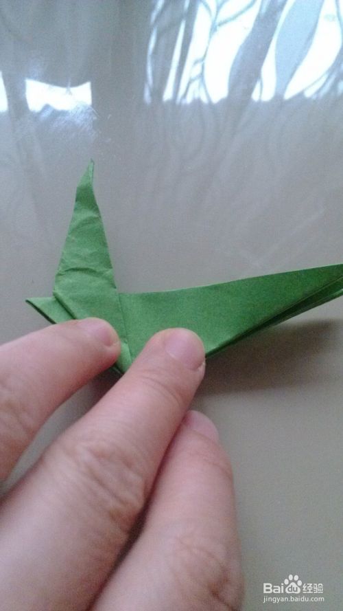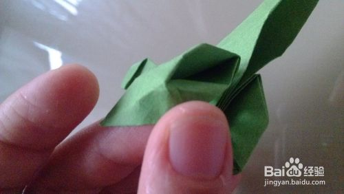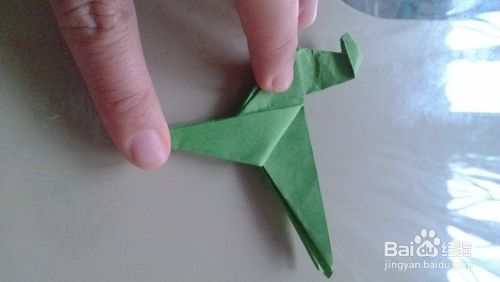 旋转下来,把头部的角也向下折一点,然后再展开并按压成一个小尖角做为恐龙的头部,把尖角往里面折收一点,下方突出的尖角也按压进去一点。如图。