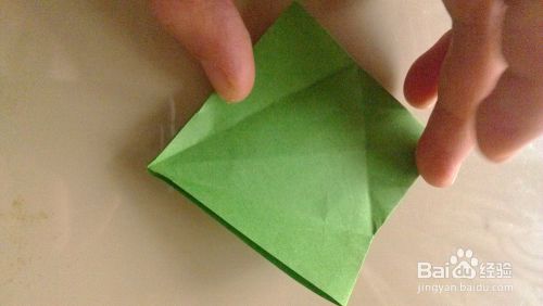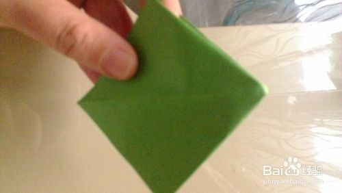 按压平整,翻一面然后旋转90度横向对折,对折后的效果就是图中那样,然后把右侧的一角边上往下折,这里需要用手做调整,可能不能一步到位,折成图中这样。