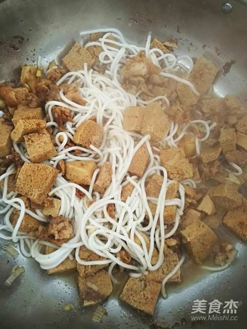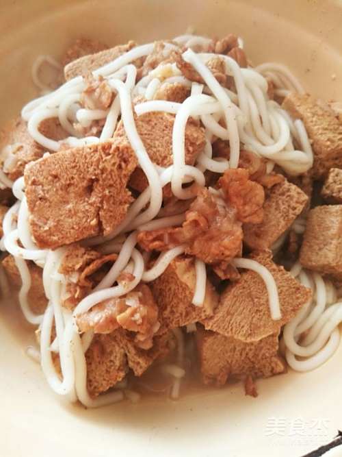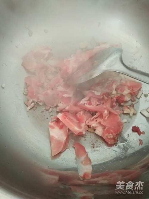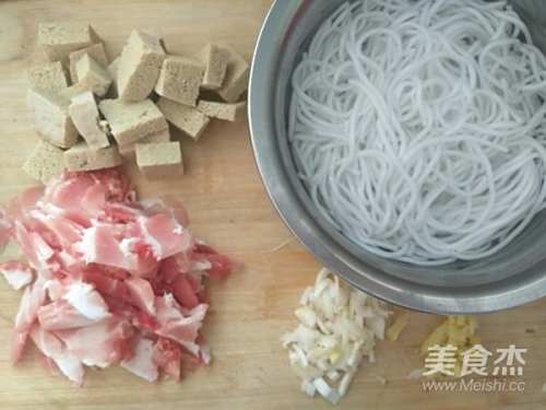 冻豆腐提前拿出来,待软了以后切块。粉条用水泡一下捞出备用。猪肉切片,葱姜切碎,
