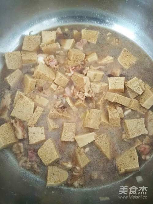 然后放入花椒粉、八角粉、盐、老抽、鸡精,最后放入冻豆腐,倒入水,大火煮开,小炖大概10分钟左右。
