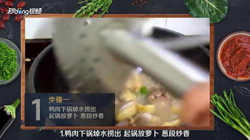 鸭肉下锅焯水捞出,起锅放胡萝卜、葱段爆香。