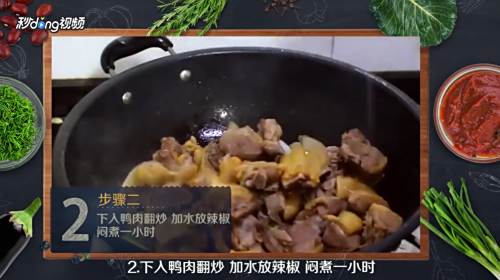 在锅中放入鸭肉进行翻炒,加入水和辣椒后焖煮一小时。