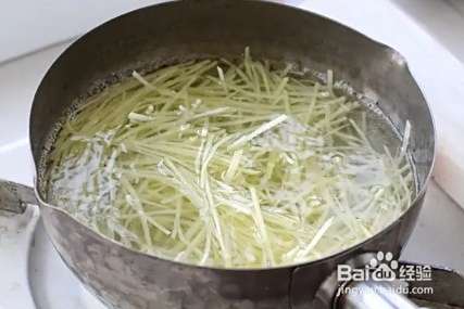切好的土豆丝用清水冲洗掉表面淀粉成分,然后放到开水中焯烫一分钟左右。