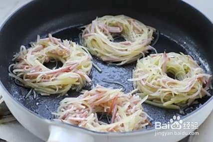 平底锅刷一层食用油,夹取适量的土豆火腿丝放到锅中,如图中整理成圆圈形状,中间要留出放蛋黄的位置。
