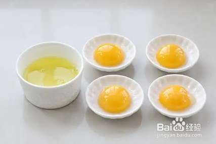 将蛋黄和蛋清分离出来,蛋清留两个,蛋黄别弄破了,分别放到小碟子中。