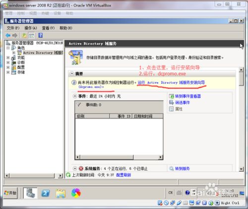 1、域控制器安装完毕之后,在角色下面会多出一个子选项。点击:“运行Active Directory域服务安装向导(depromo.exe)”