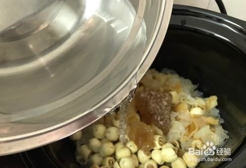 银耳提前半天泡发,我的是银耳碎,泡好直接煮 若是银耳朵的,泡发好后建议用剪刀剪成小块块再煮