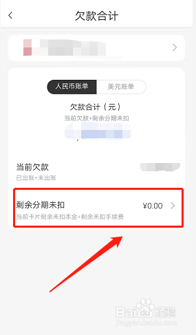 进入到欠款合计页泪敏蹲面,查看欠款的救盲金额,包含当前欠款以及剩余分期未扣,点击查看分期未扣明细。