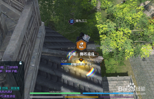 按键盘M打开地图在上方输入坐标,点击放大镜,不能直接到达,来到附近跳到上塔顶就可以了(可以按ALT+空格,再连跳就可以跳上去了,这里跳到第三层捡取“佛塔遗珠”完成捡取的第一个)