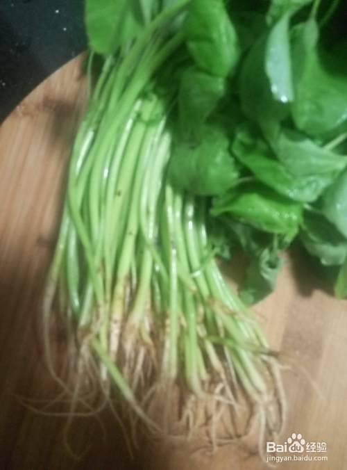 洋菜,买回时带着根茎。如果全部清洗干净,它的根也是可以吃的。不过我们一般会先将根部切去。
