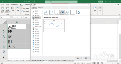 弹出窗口,单击所有图表,选择带数据标记的折线图。