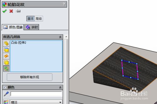 然后在右边的外观中找到“抛光钢”效果指定给实体,然后单独给拉伸特征指定轮胎花纹效果,