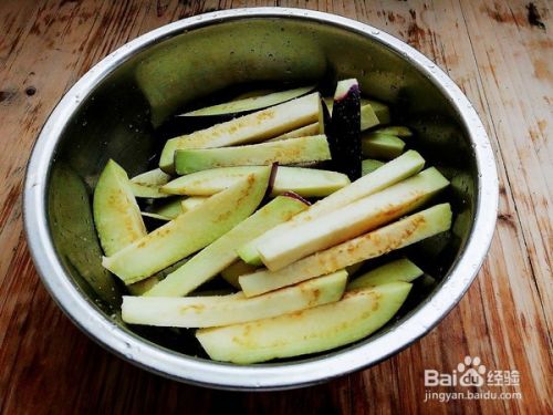 先把茄子洗净,去蒂,切成条状,撒入盐拌匀,腌制20分钟。