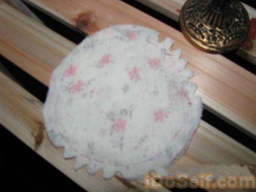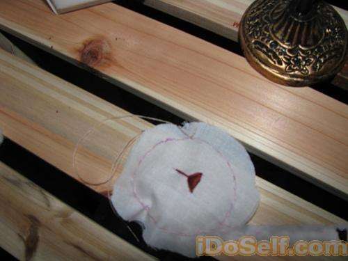 4在剪好的鼻子布上绣出鼻子,然后沿中圆的模板边缘平针抽缝