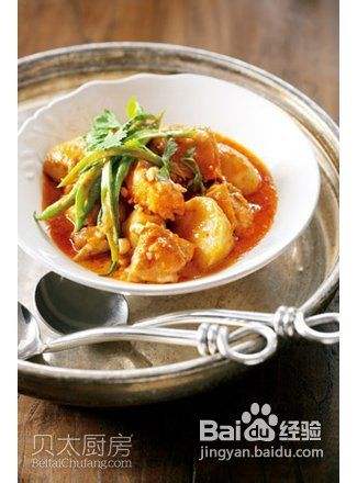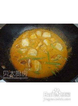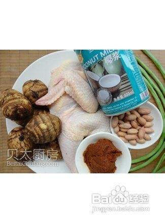 炒锅中放入蒜末、姜末煸炒出香味,加入咖喱酱翻炒片刻,然后加入椰浆和1杯水,放入芋艿块煮至软烂,加入煎好的鸡肉块、鱼露、白砂糖煮开,然后投入豇豆煮至熟透即可装入大碗中,上桌前撒上香菜叶和花生碎。