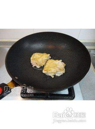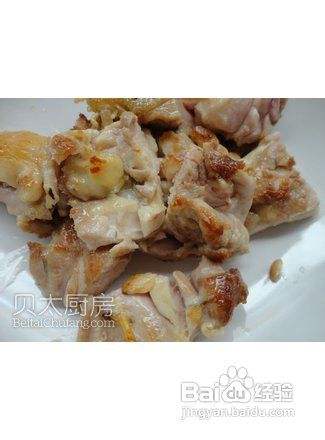 炒锅中注入油并加热至5成热,把鸡肉条有皮的一面向下排放在锅中,用中小火煎至金黄,翻面再煎2分钟,取出备用。