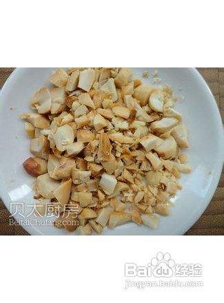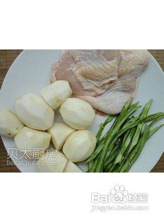 鸡腿剔骨,切成2cm宽、5cm长的条,这一步也可以请卖鸡腿的摊主代劳。豇豆洗净剖开并切成斜段。芋艿去皮,如果太大可以切成两半。花生切碎。蒜和姜分别切碎。