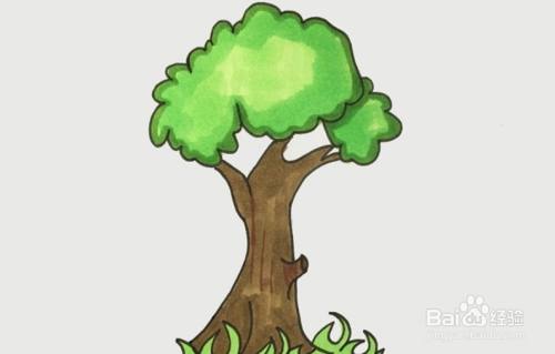 首先画出大树的树干,在树根下画出小草,接着画出树冠,先给树冠涂上绿色,边缘部分要加深阴影,再把树干涂上棕色,草地涂上绿色,一颗大树就画好了。