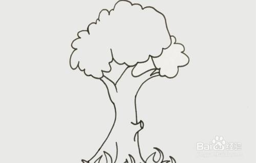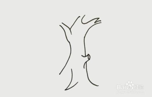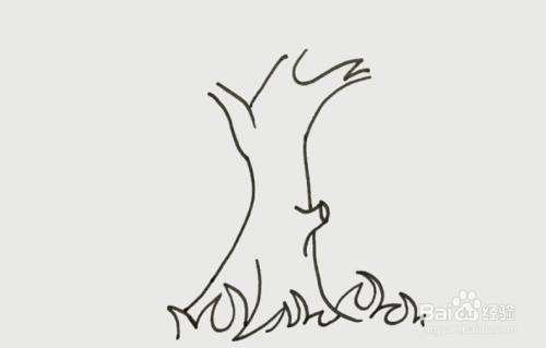 首先画出大树的树干,画树干的时候注意用的线条的流畅,画出树枝粗细不同,在树干上画出一小截树枝的细节。