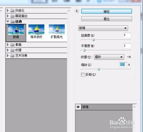 执行滤镜--扭曲--玻璃命令,设置数据如下