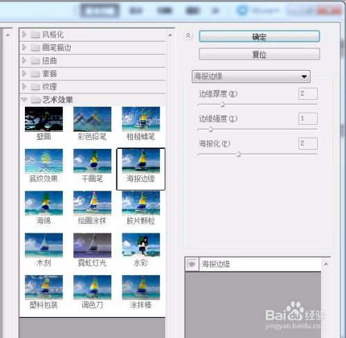 执行滤镜--滤镜库--艺术效果--海报边缘命令,设置数据如下
