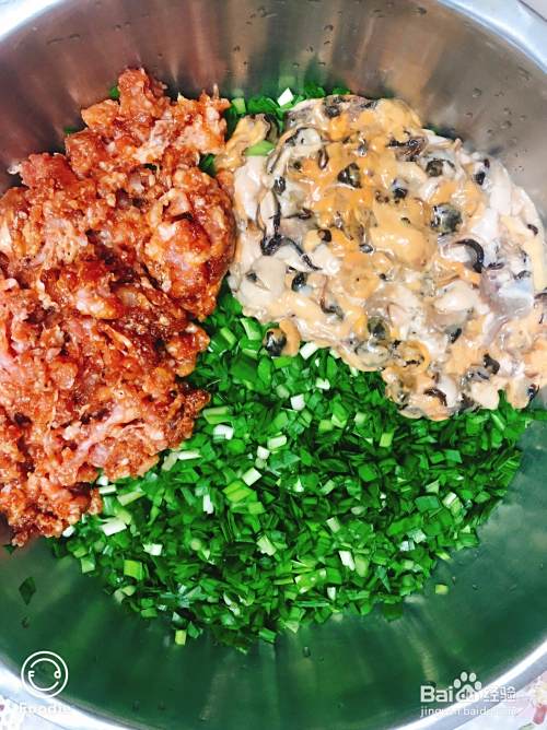 韭菜先用油搅匀,以防上汤,然后将肉和海虹肉放入韭菜中,或同方向搅匀。期间放盐,适当加油。如果你喜欢放鸡精,可以放一点。我还没放,已经够新鲜了。把它搅拌到蔬菜和肉互相混合。