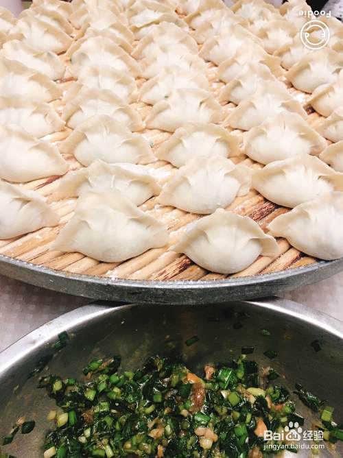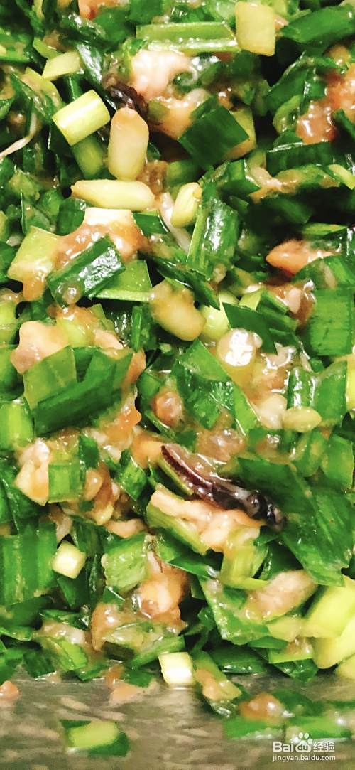 韭菜要事先洗净晾干,切碎,彩虹要用刀堵住,馅料要拌好。
