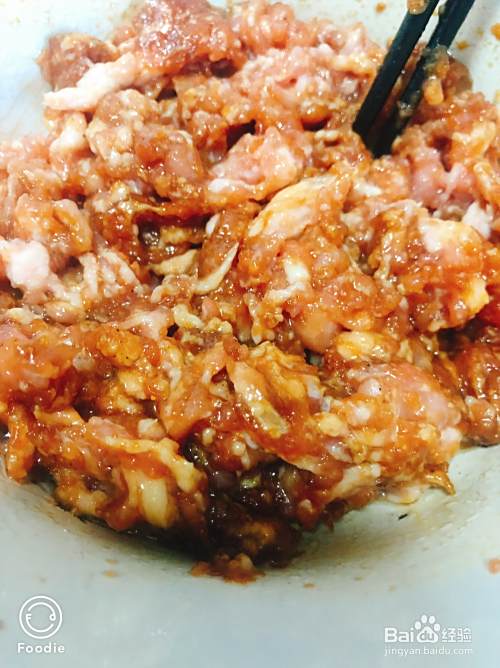 猪肉洗净,切碎捣碎,放上鲜猪肉、生姜、花椒、麻油等美味,一个方向搅拌,搅拌到上面,有点稠,不需要打水,因为下一步韭菜和海虹会煲汤,这只是一道综合性的汤。