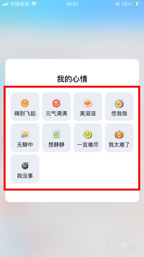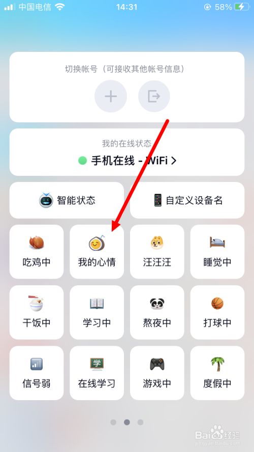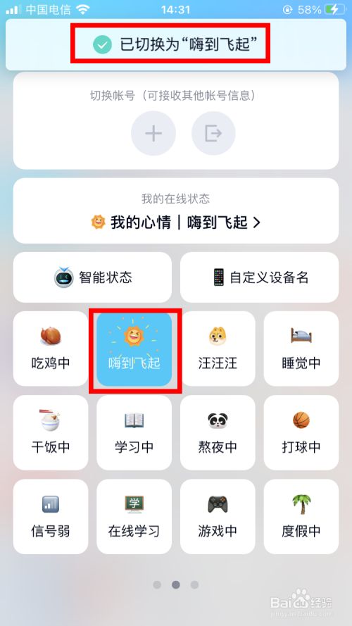 这样操作后,【在线状态】就切换成了【我的心情 嗨到飞起】。
