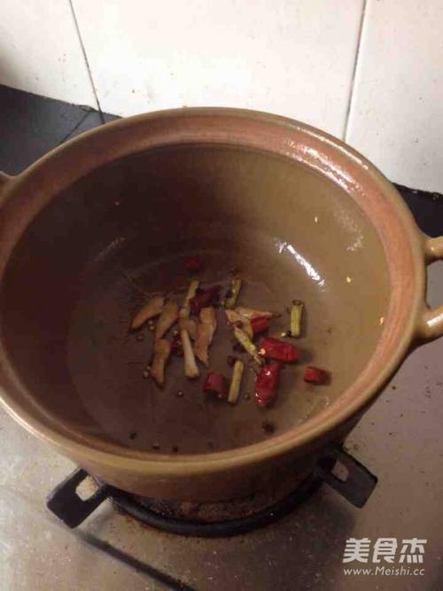 用沙锅把辅料炒出香,加入开水
