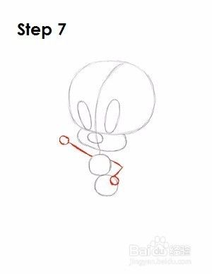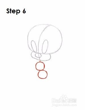 第6步:画两个互相堆叠的小圆圈作为Tweety Bird身体的指南。他们应该看起来像一个雪人。用一条小线将圆圈连接到这个Looney Tunes角色的头部。