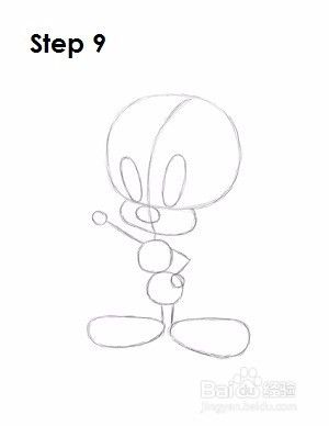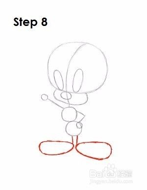 第8步:在Tweety下方鸟的身体画出两条平行的垂直线作为短腿的向导。在每条线下画一个椭圆形的形状作为Tweety大脚的指南。