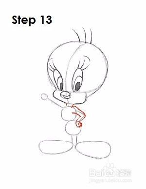 第13步:在头下划两条线,创建Tweety Bird的脖子。然后加厚指导线以创建弯曲的手臂。用曲线末尾的圆圈作为指导,将Tweety的手指画在臀部。