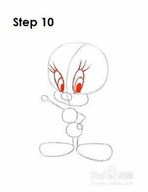 第10步:使Tweety Bird鸟眼睛的形状变暗,并在底部给它们一个小凹凸。每只眼睛上方画出三根长长的睫毛线。在每只眼睛内部为他的虹膜绘制另一个椭圆形,并且在每个虹膜内部为另一个椭圆形的Tweety Bird的瞳孔绘制阴影。