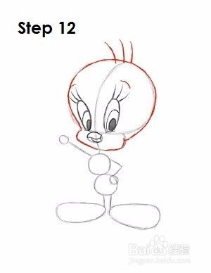 第12步:使用主要形状作为指南来绘制Tweety鸟头的其余部分。在Tweety的眼睛上方画出小曲线,用于眉毛和头上方的三条长曲线,用于梳理头发。