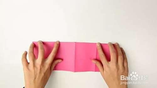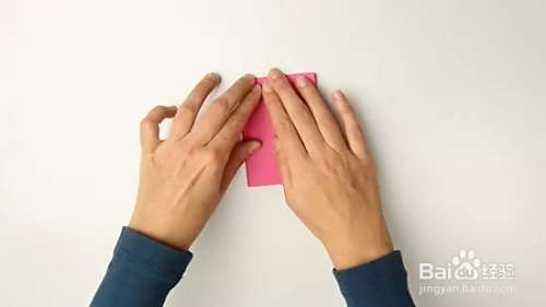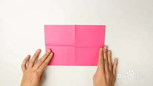 让纸的长边重合,对折。像第一次折叠那样把纸对折。纸的开口应该在折边中间。