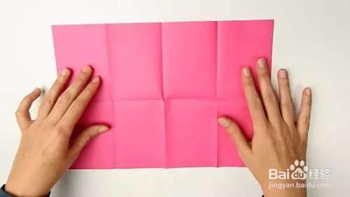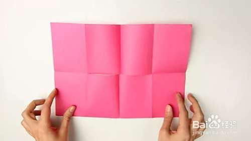 把纸展开。现在它应该还是被折痕分为八块,但是纸中间四个方块之间会有一条开口。