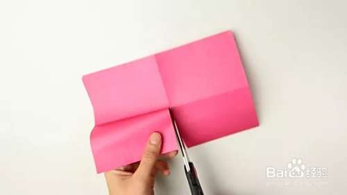 剪纸。让对折后重叠的边缘朝内。然后沿着垂直于折边中点的折痕开始剪,一直剪到与之相交且与折边平行的折痕。