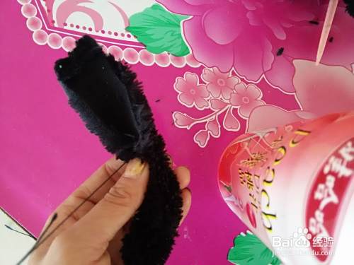 顺着布料剪下一条做尾巴,用针线像图中所示缝好,卷好布条左右下针