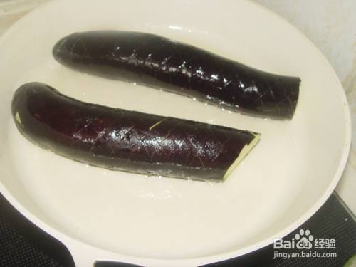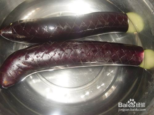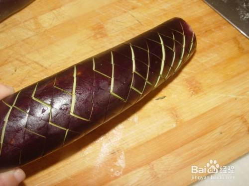 反方向,切网格形状。将茄子反过来,背面,同样切网格。